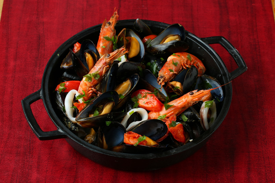 ムール&フリット エビとイカ、フレッシュトマトのプランチャ